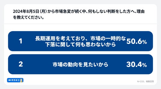 調査対象者の中で資産運用をしており、2024年8月5日(月)から市場急変が続く中、何もしなかった・情報収集している方へ、判断の理由を質問したところ、長期運用を考えており、市場の一時的な下落に関して何も思わないから50.6%、市場の動向を見たいから30.4%の順に続きました。長期投資を前提とした投資をしている方が多いことがわかります。