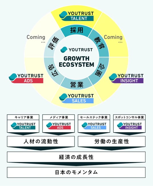 採用(TALENT)・広告(ADS)・営業(SALES)・企画(INSIGHT)といった複数の事業が連動する形で、人材の流動性と労働の生産性の双方にアプローチする「GROWTH ECOSYSTEM」へと事業領域を広げています。