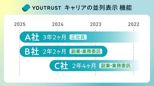 その一環として、複数の所属(正社員・副業・業務委託・インターンなど)が同時期に存在する場合でも、ガントチャート形式で可視化できる「キャリアの並列表示機能」の提供を開始しました。