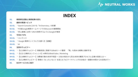株式会社ニュートラルワークス(本社:神奈川県藤沢市、代表取締役:三木五月、以下「ニュートラルワークス」)は、自社の専門領域であるSEO対策に関して、最新の業界動向をまとめた『SEOトレンドレポート 2025年5月号』を公開いたしました。
