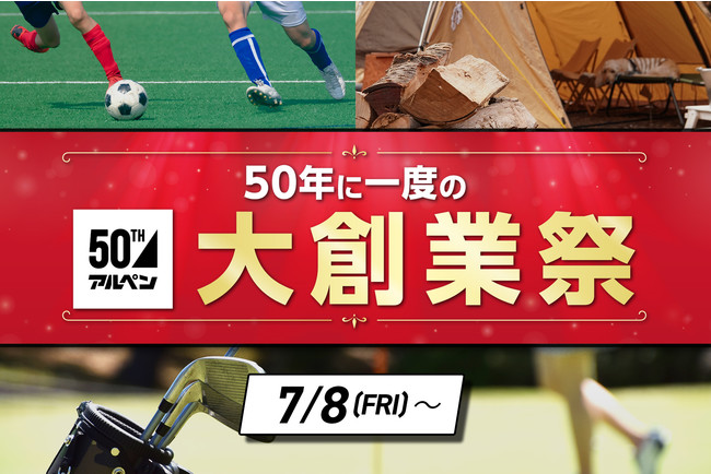 スポーツ用品販売の株式会社アルペン(本社:愛知県名古屋市、代表取締役社長:水野敦之)は、7月8日(金)に創業50年を迎えます。50年のご愛顧に感謝を込めて、7月8日(金)からスポーツデポ、アルペン、ゴルフ5、アルペンアウトドアーズの全国アルペングループ店舗と公式オンラインストアにて50周年スペシャルセール「大創業祭」を開催いたします。