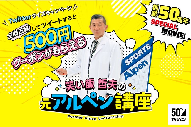 「元アルペン講座」は、テレビ番組の中で笑い飯の哲夫さんが披露したネタであり、過去にアルペンだった店舗が、現在はアルペンの象徴とも言える巨大三角看板を活用し、様々なかたちで再利用している様子を解説したネタです。この度は創業50周年記念版として、これまでに披露していない“元アルペン”をご紹介するとともに、現在のアルペングループ店舗について楽しく解説。さらに、出題される3つのクイズに全問正解した方に、もれなくアルペングループ全店と公式オンラインストアでご利用できる500円割引クーポンプレゼントについてご紹介いたします。大変お得な「大創業祭」と合わせて是非ご利用ください。