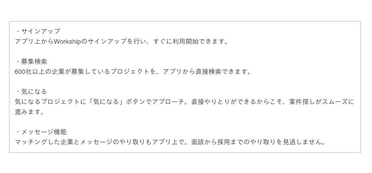 『Workship』では、仕事を見つけたいユーザーと、仕事を依頼したい企業がスムーズにマッチングするよう、以下のような機能を提供して います。