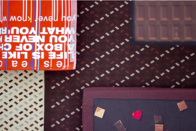 ビター、スイート、ミルク、ホワイト、それぞれの板チョコを並べ、小紋柄に表現したユニークなハンカチーフ。