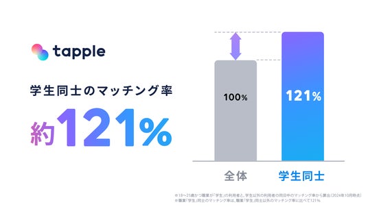 「タップル」において、プロフィールの職業項目を「学生」に設定した利用者同士のマッチング率は、「学生」以外に設定している利用者とのマッチング率と比較して121%(※2)と高く、さらに「タップル」に新規登録した学生利用者が、登録後24時間以内にマッチングする割合は約94%(※3)に達しており、環境やライフスタイルが近しい「学生」同士がマッチングしやすい傾向にあることがわかっております。