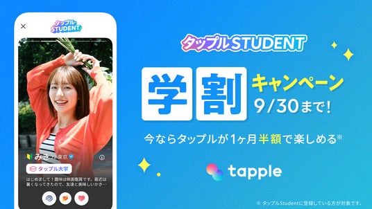 株式会社タップル(本社:東京都渋谷区、代表取締役社長:平松繁和)は運営するマッチングアプリ「タップル」において、学生利用者限定機能「タップルStudent」に登録した新規利用者を対象とした学割キャンペーンを、2025年8月1日(金)より開始いたします。