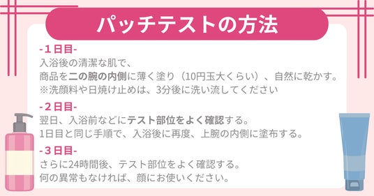 化粧品を初めて使用する際は、パッチテストを行い、肌にアレルギー反応等が出ないか確認しましょう。