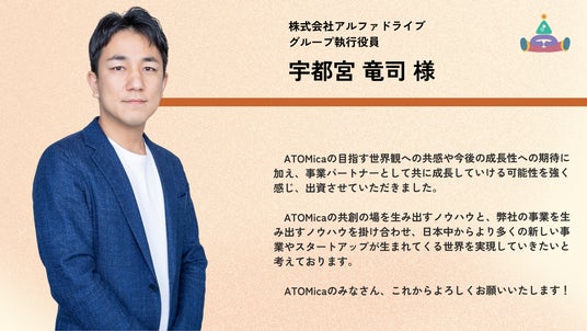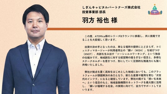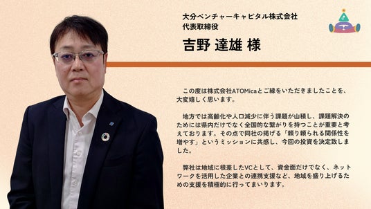 株式会社ATOMica(本社:宮崎県宮崎市、代表取締役Co-CEO:嶋田瑞生・南原一輝、以下「ATOMica」)は、シリーズBラウンドのファイナルクローズを完了したことをお知らせいたします。2025年6月の1stクローズ、同年7月の2ndクローズに続き、今回新たに11社の新規株主のみなさまを迎え、本ラウンド総額は5.7億円、増資を通じた累計資金調達額は19億円となりました。
