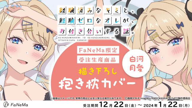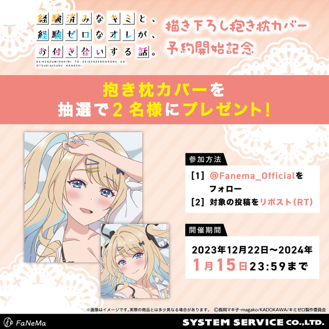 システムサービス株式会社(本社:東京都豊島区、代表取締役社長:田村宗弘)は、アニメ・マンガ・ゲーム作品等のキャラクター商品の企画・製作・販売をする自社ECサイト「FaNeMa」(URL:https://fanema.jp/)にて、TVアニメ『経験済みなキミと、経験ゼロなオレが、お付き合いする話。』より「抱き枕カバー」を発売いたします。