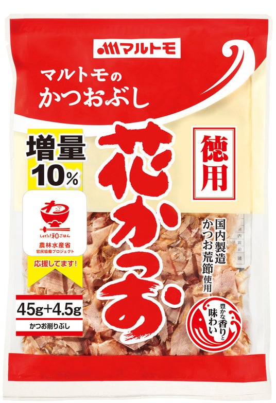 かつお節・だしと、海洋資源を通じて健康と食文化の発展に貢献するマルトモ株式会社(社長:今井均 本社:愛媛県伊予市)は、売れ筋商品である「徳用花かつお45g」「徳用かつおパック1.5g×20」の2品について数量限定10%増量キャンペーンを実施いたします。