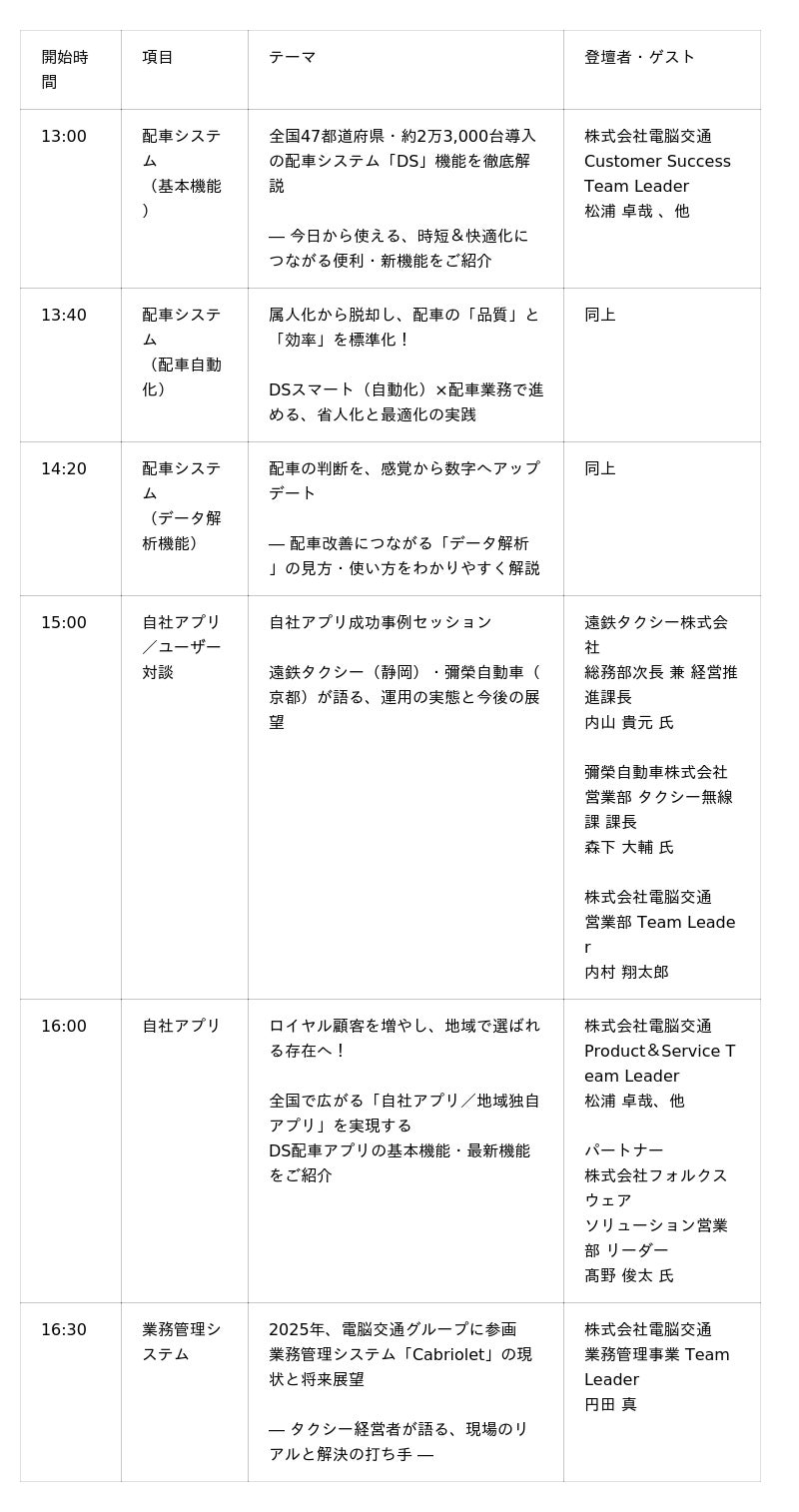 - 電脳交通によるプロダクト/事業発表、業界内スペシャルゲストの基調講話、有識者対談、事業者同士の意見交換(予定)