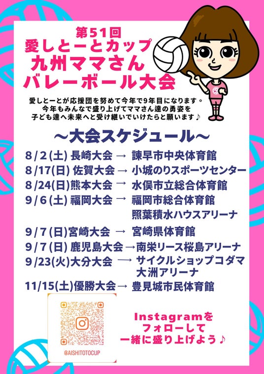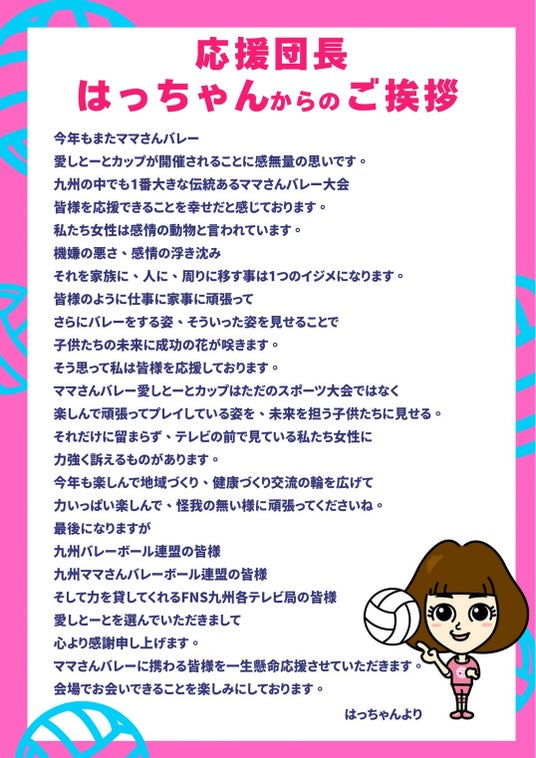 福岡県那珂川市に本社を置く株式会社愛しとーと(代表:岩本初恵)は、今年で51回目を迎える歴史ある「九州ママさんバレーボール大会」に、応援団として9年目の今年もサポートすることを発表いたします。
