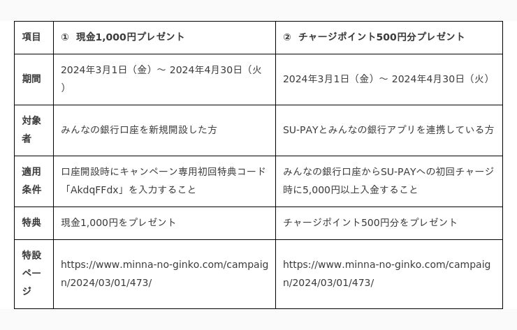 1.キャンペーン専用初回特典コードを入力してみんなの銀行口座を新規開設していただくと現金1,000円を、2.みんなの銀行口座からSU-PAYへの初回チャージ時に5,000円以上入金していただくとトライアルでのお買い物にご利用いただけるチャージポイント500円分をプレゼントします。