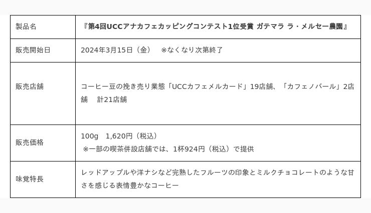 UCC上島珈琲株式会社(本社/兵庫県神戸市、資本金/10 億円、社長/朝田文彦、以下UCC)は、UCCとアナカフェ※1が協働して2023年に開催したサステナブルな取り組みも重視した品質コンテスト「第4回UCCアナカフェカッピングコンテスト」において第1位に輝いた『ガテマラ ラ・メルセー農園』のコーヒーを、UCC直営のコーヒー豆の挽き売り業態「UCCカフェメルカード」「カフェノバール」21店舗にて、3月15日(金)に数量限定で発売します。