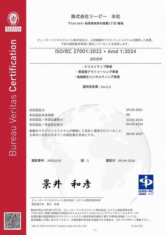 株式会社リーピー(本社:岐阜県岐阜市、代表取締役:川口 聡、以下:当社)は、2026年3月に実施された情報セキュリティマネジメントシステム(ISMS)の維持審査(第4・5回)を経て、2026年4月9日付で認証の継続が決定されましたのでお知らせいたします。