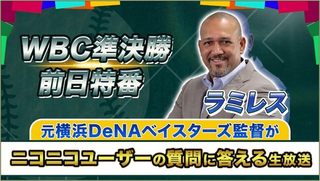 株式会社ドワンゴ(本社:東京都中央区、代表取締役社長:夏野剛)は、ライブ配信サービス「ニコニコ生放送」にて、WBC準決勝前日特番「ラミレス元横浜DeNAベイスターズ監督がユーザーの質問に答える生放送」を3月20日(月)19時よりお送りします。