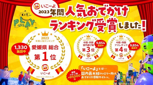 総合エンターテイメント企業・キスケ株式会社(本社:愛媛県松山市、代表:山路義則)が運営する「KIT PLAY」が、「いこーよ人気おでかけランキング」(アクトインディ(株)主催)において多くの賞を受賞しました。「いこーよ」は国内最大級のお出かけ情報サイトで掲載スポット数全国約97,000件(2023年12月20日時点)にのぼります。年間ランキングは施設紹介ページの閲覧件数、クチコミ評価など独自の視点で集計によりランキングされたものです。