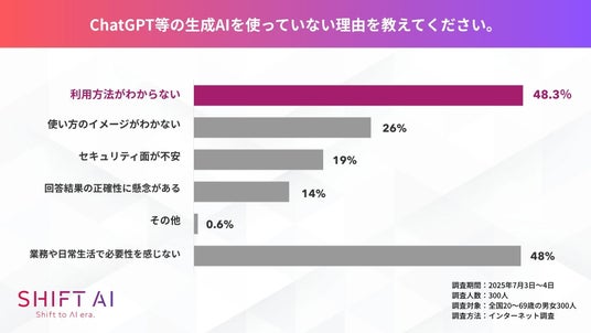 「日本をAI先進国に」を掲げ、AIのビジネス活用を学べる利用者数No.1※のAI大学「SHIFT AI」を運営する株式会社SHIFT AI(東京都渋谷区、代表取締役 木内翔大、以下 当社)は、全国の男女20~69歳の3000名を対象に、ChatGPTなどの生成AIの活用に関する意識調査を実施しました。