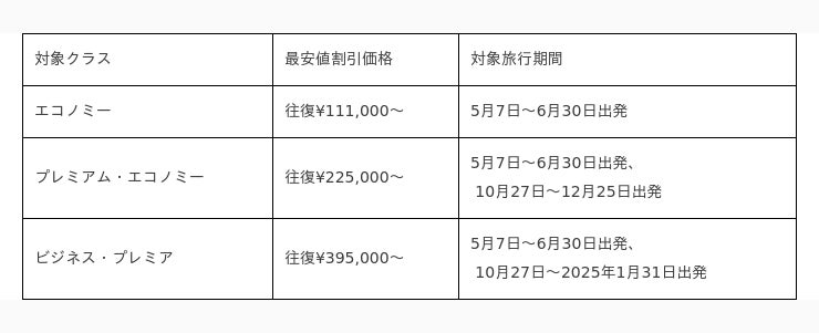 上記表示運賃は最安値であり、他の時期もセール運賃のご用意がございます。詳しい情報は公式サイトでご確認ください。