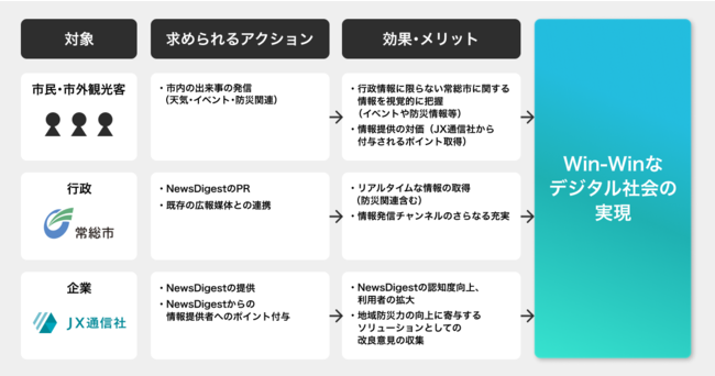 当社では、地域防災力の向上に貢献する目的で「NewsDigest」の利用を推進してきましたが、地域防災力向上のためのソリューションとして、行政が地域に「NewsDigest」の利用を推進していく取組みは東日本初となります。