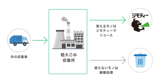 自治体が回収したモノのうち、再利用が可能なモノをジモティー内に設けた自治体の専用ページにて出品し、必要とする近隣住民とのマッチングを図ります。