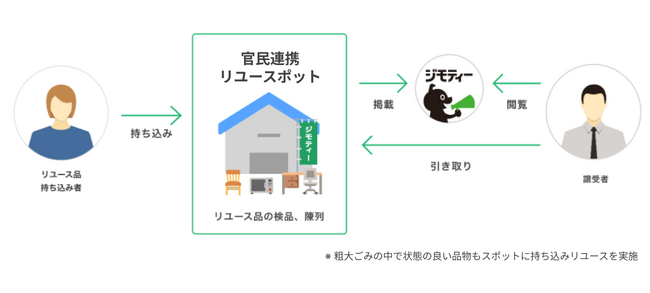 住民が不要となった再利用可能なモノを気軽に持ち込める場を設け、回収品をジモティーに出品します。ジモティーを通して必要とする近隣住民に譲渡できるスキームを自治体と共同で構築しています。