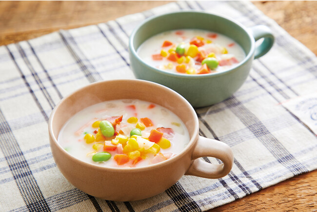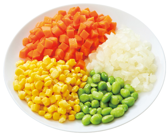 ミックスベジタブルは全てを国産の産直原料で賄えるよう、コーン、人参、玉ねぎに加え、子どもが好む枝豆を緑の彩りに採用しました。玉ねぎも入っているので加熱により甘みが出て、料理に味わいが増します。4種の野菜を冷凍のまま手軽に調理でき、スープやチャーハンなど多様な料理に彩りを加えられます。