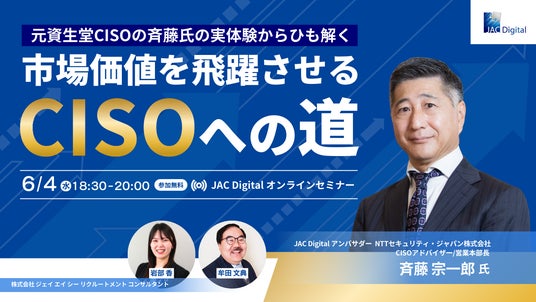 世界11ヵ国で人材紹介事業を展開する業界大手の株式会社 ジェイ エイ シー リクルートメント(代表取締役社長:田崎 ひろみ、本社:東京都千代田区)は、『元資生堂CISOの斉藤氏の実体験からひも解く、市場価値を飛躍させるCISOへの道』と題したオンラインセミナーを6月4日(水)に開催いたします。