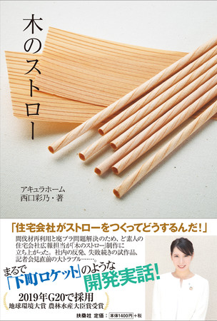 アキュラホームは、木を活かす・守る活動の一環として、環境問題化しているプラスチックごみ問題、森林保全にも貢献可能である木のストロー開発に着手。日本の匠の技である、カンナ削りの技術を駆使して世界で初めて木のストローの開発・量産化に成功しました。現在は、地域の木材を使用し、地域の高齢者、障がい者に制作を担っていただくなど、「地産地消モデル」を確立し、雇用の創出にもつなげています。木のストローは、2019年に開催されたG20のすべての会合で採用されたほか、ウッドデザイン賞、グッドデザイン賞、地球環境大賞など、数々の賞を受賞。大きな注目を集め、環境に貢献できるアイテムとしてホテルや空港での導入も実現しています。そして、この度アキュラホームが木のストローの開発から普及に至るまで、さらには現在までの木のストローをとりまく様々な物語を描いた本が扶桑社より出版が決定しました。