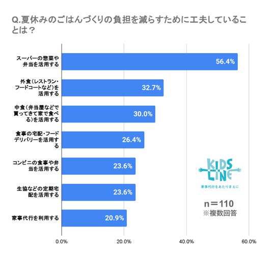 最も多かったのは「スーパーの総菜や弁当を活用する」で半数以上の方が利用しています。また外食や中食、フードデリバリー、コンビニ、生協など、多くの親御様が複数の方法を駆使して夏休みを乗り切っていることが明らかになりました。
