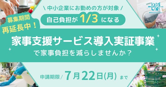 キッズラインでは「家事支援サービス福利厚生導入実証事業」について、現在のところ7月22日(月)締切で、追加の事業者募集を受け付けております。