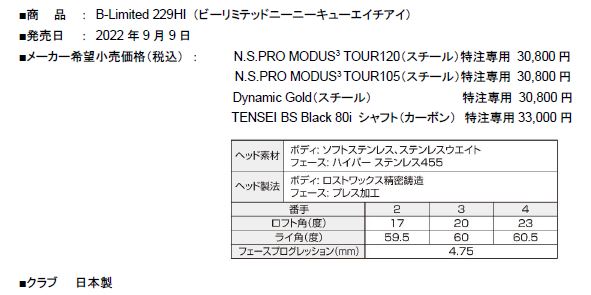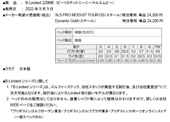 メーカー希望小売価格※2は、『 B-Limited 415』が 82,500円( 特注専用、税抜価格 75,000円、TOUR AD BS-6 シャフト)、『 B-Limited 229HI』は 30,800円 特注専用、 税抜価格 28,000円 N.S.PRO MODUS3 TOUR120/105、Dynamic Goldシャフト 、 『 B-Limited 220MB』が 1本 24,200円( 特注専用、税抜価格 22,000円、 N.S.PRO MODUS3 TOUR120、Dynamic Goldシャフト)、にて 発売します。