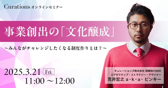 顧客企業のビジネス変革を成功に導くキュレーションズ株式会社(本社:東京都渋谷区、代表取締役社長:根本隆之、以下当社)は、『事業創出の「文化醸成」~みんながチャレンジしたくなる制度作りとは?~』を2025年3月21日(金)に開催いたします