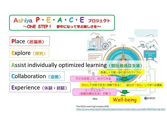 本プロジェクトは「安心」と「対話」をキーワードとしており、コンセプトは「Place(居場所)」「Explore(探求)」「Assist individually optimized learning(個別最適な支援)」「Collaboration(協働)」「Experience(体験・経験)」の5つで構成されています。本プロジェクトの施策として、小・中学校へのPEACEサポーターの派遣や、保護者や学生・学校関係者などが芦屋市の教育について考える「Ashiya Education Day」などを実施しています。
