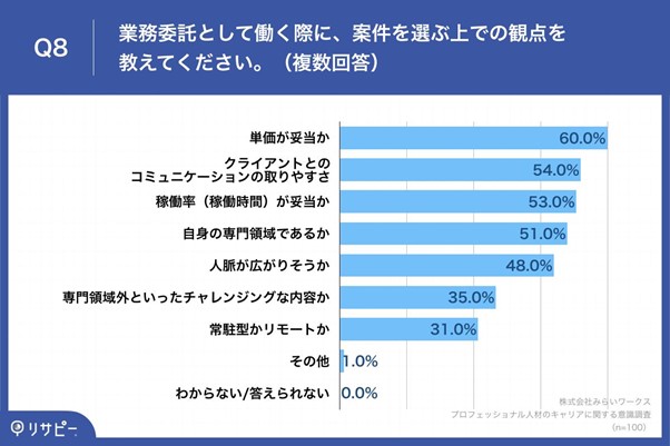 「Q8.業務委託として働く際に、案件を選ぶ上での観点を教えてください。(複数回答)」(n=100)と質問したところ、「単価が妥当か」が60.0%、「クライアントとのコミュニケーションの取りやすさ」が54.0%、「稼働率(稼働時間)が妥当か」が53.0%という回答となりました。