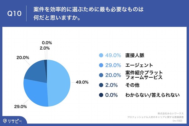 「Q10.案件を効率的に選ぶために最も必要なものは何だと思いますか。」(n=100)と質問したところ、「直接人脈」が49.0%、「エージェント」が29.0%という回答となりました。