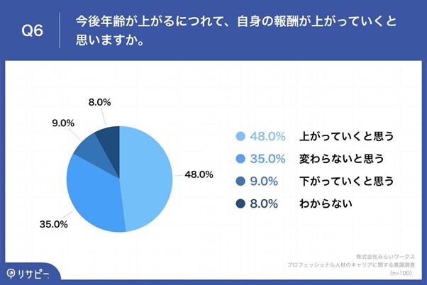 「Q6.今後年齢が上がるにつれて、自身の報酬が上がっていくと思いますか。」(n=100)と質問したところ、「上がっていくと思う」が48.0%、「変わらないと思う」が35.0%という回答となりました。