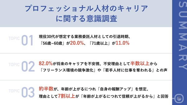 その背景には「将来のキャリアを不安視している」方が8割以上いることからも読み取れ、不安を抱える理由には、半数以上から「フリーランス環境の競争が激化する点」や「若手人材に仕事を奪われる点」が挙げられています。一方で、年齢が上がるにつれ「信頼が上がる」などの理由から、約半数の方が「自身の報酬アップ」を想定していることも分かりました。