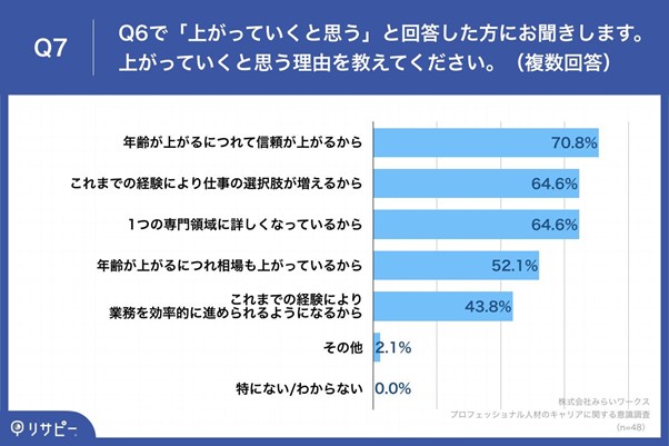 Q6で「上がっていくと思う」と回答した方に、「Q7.上がっていくと思う理由を教えてください。(複数回答)」(n=48)と質問したところ、「年齢が上がるにつれて信頼が上がるから」が70.8%、「これまでの経験により仕事の選択肢が増えるから」が64.6%、「1つの専門領域に詳しくなっているから」が64.6%という回答となりました。