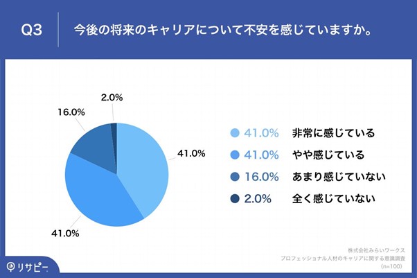 「Q3.今後の将来のキャリアについて不安を感じていますか。」(n=100)と質問したところ、「非常に感じている」が41.0%、「やや感じている」が41.0%という回答となりました。