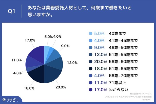 「Q1.あなたは業務委託人材として、何歳まで働きたいと思いますか。」(n=100)と質問したところ、「56歳~60歳まで」が20.0%、「61歳~65歳まで」が18.0%という回答となりました。