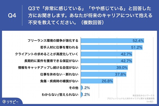 Q3で「非常に感じている」「やや感じている」と回答した方に、「Q4.あなたが将来のキャリアについて抱える不安を教えてください。(複数回答)」(n=82)と質問したところ、「フリーランス環境の競争が激化する」が52.4%、「若手人材に仕事を奪われる」が51.2%、「クライアントの求めることが高度化していく」が42.7%、「長期的に案件を獲得できる保証がない」が42.7%という回答となりました。