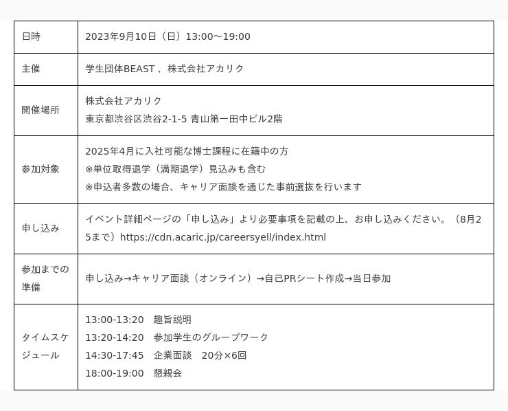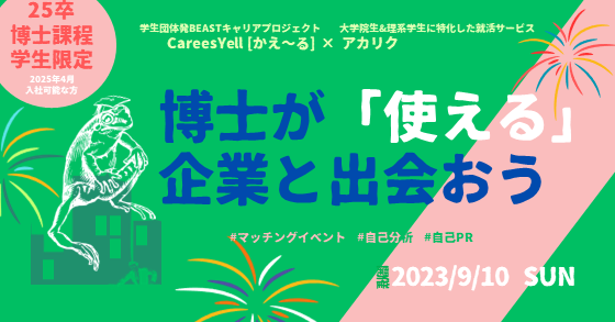 本イベントは、BEAST発のキャリアプロジェクト、CareersYell [かえ~る]とアカリクが共催する博士課程の学生(以下 博士学生)対象のイベントです。