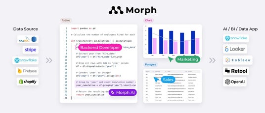 Morphでは、たった数分でデータパイプラインを構築します。次々と変わる現場の要望に対応するために、柔軟なデータ処理環境を用意し、AIエージェント・BIツールのためのデータ準備を迅速に実行します。 150以上のデータソースに対応し、生成AIを活用してデータクレンジングやデータ変換をサポートします。またデータ処理結果をPostgresのテーブルとして持つことにより、BIツール等の外部ツールへのクイックな連携を実現します。