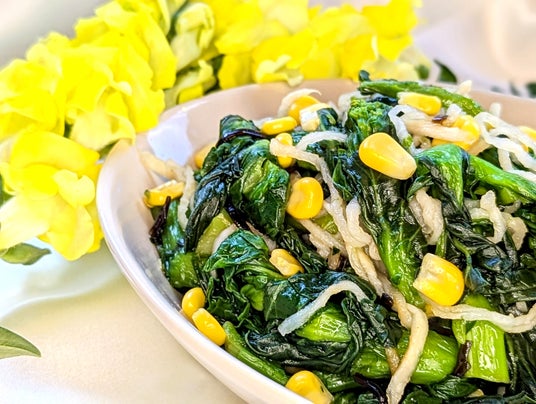 独特のほろ苦さが春らしい菜の花に、塩昆布の旨みとコーンの甘み、切り干し大根の食感を合わせました。からしがふんわりと香り、だしの旨みがぎゅっと染み込んだ春らしい逸品です。