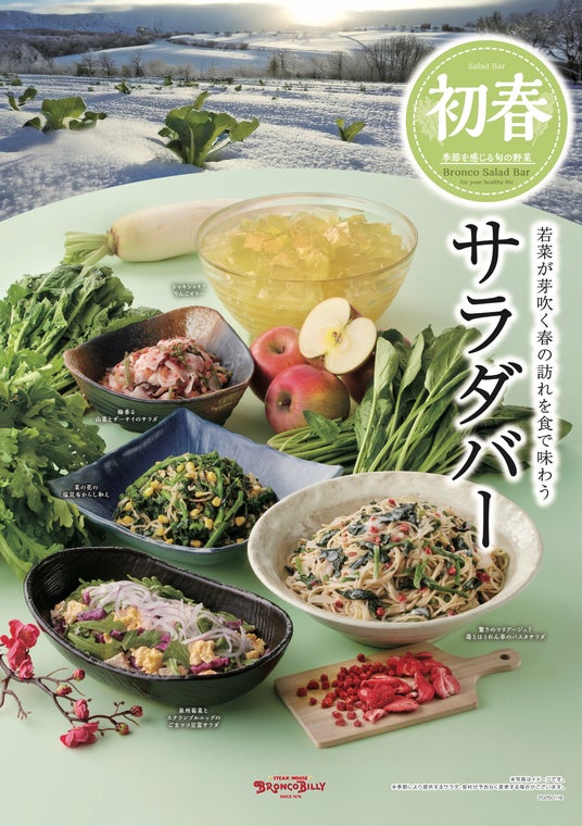 年が明け、まだまだ雪に関するニュースが多いですが、土の中では春の準備が始まろうとしています。ブロンコビリーでは、暖かい季節の訪れが待ち遠しいこの時季、季節限定で『初春サラダバー』の提供を1月16日(木)より順次開始いたします。