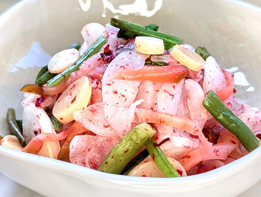 春の訪れを感じさせるような、梅の風味が華やかなさっぱりとした大根のサラダです。寒さによりみずみずしさと甘さが増した大根と、春らしいわらびなどの山菜、食感のよいザーサイがよく合います。