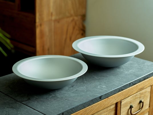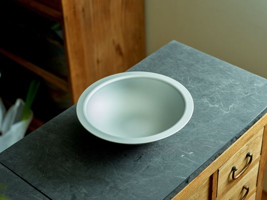 美しい曲面は、手仕事に近い技術を要する “へら絞り”で一枚ずつていねいに成形し、ブラスト加工で洗練された渋みのある質感を表しています。