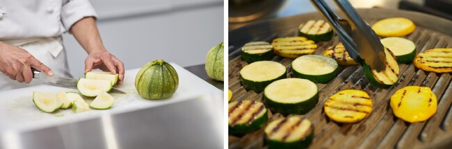 今回のテーマは、この時期に旬を迎える「ズッキーニ」。緑ズッキーニ、黄ズッキーニ、そして市場にはあまり出回らない丸ズッキーニを、炙って、生で、グリルして。品種と調理法、カットにもこだわり、その魅力を味わえるサラダが出来上がりました。