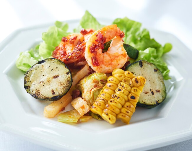炙ることで、香ばしさとみずみずしさを兼ね揃えたズッキーニと、グリルした海老ととうもろこしを合わせたサラダ。旨味・香り・辛味がやみつきになる「食べるハリッサ」が具材に絡み、食欲そそる味わいに仕上がっています。